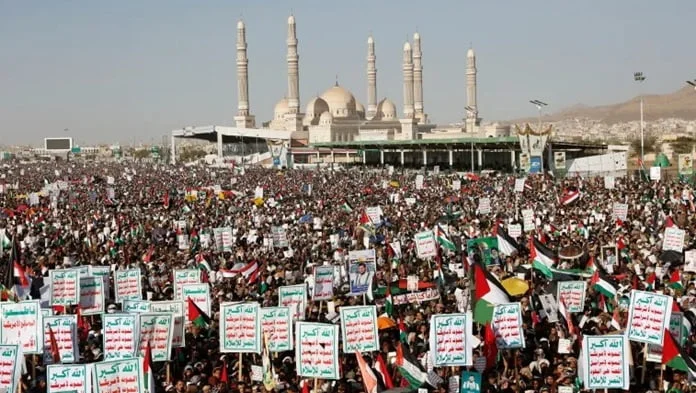 The Houthi movement—inspired by Shia Islam—controls the west of Yemen, including the capital Sanaa and the Red Sea coast. They have massive backing for their campaign in solidarity with Palestine, with huge numbers rallying in Sanaa.